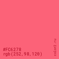 Цвет #FC6278 в цветовой модели RGB обозначается тремя октетами (252, 98, 120) в десятичном формате и #FC6278 в шестнадцатиричном (hex) формате, которые являются интенсивностью красного 252 (hex FC), интенсивность зелёного 98 (hex 62) и интенсивность синего 120 (hex 78).