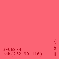 Цвет #FC6374 в цветовой модели RGB обозначается тремя октетами (252, 99, 116) в десятичном формате и #FC6374 в шестнадцатиричном (hex) формате, которые являются интенсивностью красного 252 (hex FC), интенсивность зелёного 99 (hex 63) и интенсивность синего 116 (hex 74).