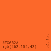 Цвет #FC682A в цветовой модели RGB обозначается тремя октетами (252, 104, 42) в десятичном формате и #FC682A в шестнадцатиричном (hex) формате, которые являются интенсивностью красного 252 (hex FC), интенсивность зелёного 104 (hex 68) и интенсивность синего 42 (hex 2A).