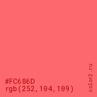 Цвет #FC686D в цветовой модели RGB обозначается тремя октетами (252, 104, 109) в десятичном формате и #FC686D в шестнадцатиричном (hex) формате, которые являются интенсивностью красного 252 (hex FC), интенсивность зелёного 104 (hex 68) и интенсивность синего 109 (hex 6D).