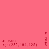 Цвет #FC6880 в цветовой модели RGB обозначается тремя октетами (252, 104, 128) в десятичном формате и #FC6880 в шестнадцатиричном (hex) формате, которые являются интенсивностью красного 252 (hex FC), интенсивность зелёного 104 (hex 68) и интенсивность синего 128 (hex 80).