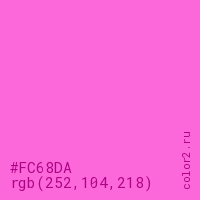 Цвет #FC68DA в цветовой модели RGB обозначается тремя октетами (252, 104, 218) в десятичном формате и #FC68DA в шестнадцатиричном (hex) формате, которые являются интенсивностью красного 252 (hex FC), интенсивность зелёного 104 (hex 68) и интенсивность синего 218 (hex DA).