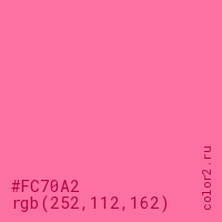 Цвет #FC70A2 в цветовой модели RGB обозначается тремя октетами (252, 112, 162) в десятичном формате и #FC70A2 в шестнадцатиричном (hex) формате, которые являются интенсивностью красного 252 (hex FC), интенсивность зелёного 112 (hex 70) и интенсивность синего 162 (hex A2).