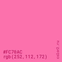 Цвет #FC70AC в цветовой модели RGB обозначается тремя октетами (252, 112, 172) в десятичном формате и #FC70AC в шестнадцатиричном (hex) формате, которые являются интенсивностью красного 252 (hex FC), интенсивность зелёного 112 (hex 70) и интенсивность синего 172 (hex AC).
