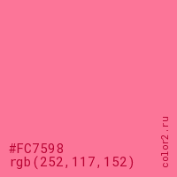 Цвет #FC7598 в цветовой модели RGB обозначается тремя октетами (252, 117, 152) в десятичном формате и #FC7598 в шестнадцатиричном (hex) формате, которые являются интенсивностью красного 252 (hex FC), интенсивность зелёного 117 (hex 75) и интенсивность синего 152 (hex 98).