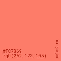 Цвет #FC7B69 в цветовой модели RGB обозначается тремя октетами (252, 123, 105) в десятичном формате и #FC7B69 в шестнадцатиричном (hex) формате, которые являются интенсивностью красного 252 (hex FC), интенсивность зелёного 123 (hex 7B) и интенсивность синего 105 (hex 69).
