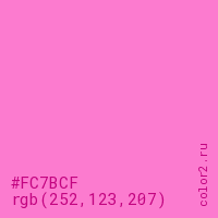 Цвет #FC7BCF в цветовой модели RGB обозначается тремя октетами (252, 123, 207) в десятичном формате и #FC7BCF в шестнадцатиричном (hex) формате, которые являются интенсивностью красного 252 (hex FC), интенсивность зелёного 123 (hex 7B) и интенсивность синего 207 (hex CF).