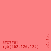 Цвет #FC7E81 в цветовой модели RGB обозначается тремя октетами (252, 126, 129) в десятичном формате и #FC7E81 в шестнадцатиричном (hex) формате, которые являются интенсивностью красного 252 (hex FC), интенсивность зелёного 126 (hex 7E) и интенсивность синего 129 (hex 81).