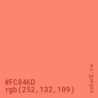 Цвет #FC846D в цветовой модели RGB обозначается тремя октетами (252, 132, 109) в десятичном формате и #FC846D в шестнадцатиричном (hex) формате, которые являются интенсивностью красного 252 (hex FC), интенсивность зелёного 132 (hex 84) и интенсивность синего 109 (hex 6D).