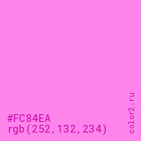 Цвет #FC84EA в цветовой модели RGB обозначается тремя октетами (252, 132, 234) в десятичном формате и #FC84EA в шестнадцатиричном (hex) формате, которые являются интенсивностью красного 252 (hex FC), интенсивность зелёного 132 (hex 84) и интенсивность синего 234 (hex EA).
