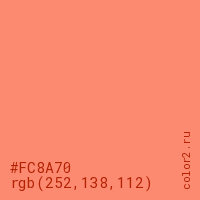 Цвет #FC8A70 в цветовой модели RGB обозначается тремя октетами (252, 138, 112) в десятичном формате и #FC8A70 в шестнадцатиричном (hex) формате, которые являются интенсивностью красного 252 (hex FC), интенсивность зелёного 138 (hex 8A) и интенсивность синего 112 (hex 70).