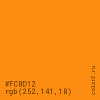 Цвет #FC8D12 в цветовой модели RGB обозначается тремя октетами (252, 141, 18) в десятичном формате и #FC8D12 в шестнадцатиричном (hex) формате, которые являются интенсивностью красного 252 (hex FC), интенсивность зелёного 141 (hex 8D) и интенсивность синего 18 (hex 12).