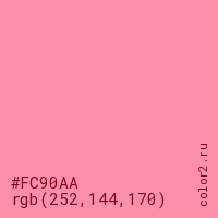 Цвет #FC90AA в цветовой модели RGB обозначается тремя октетами (252, 144, 170) в десятичном формате и #FC90AA в шестнадцатиричном (hex) формате, которые являются интенсивностью красного 252 (hex FC), интенсивность зелёного 144 (hex 90) и интенсивность синего 170 (hex AA).