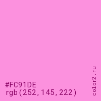 Цвет #FC91DE в цветовой модели RGB обозначается тремя октетами (252, 145, 222) в десятичном формате и #FC91DE в шестнадцатиричном (hex) формате, которые являются интенсивностью красного 252 (hex FC), интенсивность зелёного 145 (hex 91) и интенсивность синего 222 (hex DE).