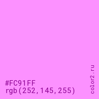 Цвет #FC91FF в цветовой модели RGB обозначается тремя октетами (252, 145, 255) в десятичном формате и #FC91FF в шестнадцатиричном (hex) формате, которые являются интенсивностью красного 252 (hex FC), интенсивность зелёного 145 (hex 91) и интенсивность синего 255 (hex FF).