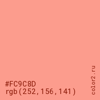 Цвет #FC9C8D в цветовой модели RGB обозначается тремя октетами (252, 156, 141) в десятичном формате и #FC9C8D в шестнадцатиричном (hex) формате, которые являются интенсивностью красного 252 (hex FC), интенсивность зелёного 156 (hex 9C) и интенсивность синего 141 (hex 8D).