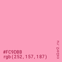 Цвет #FC9DBB в цветовой модели RGB обозначается тремя октетами (252, 157, 187) в десятичном формате и #FC9DBB в шестнадцатиричном (hex) формате, которые являются интенсивностью красного 252 (hex FC), интенсивность зелёного 157 (hex 9D) и интенсивность синего 187 (hex BB).