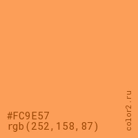 Цвет #FC9E57 в цветовой модели RGB обозначается тремя октетами (252, 158, 87) в десятичном формате и #FC9E57 в шестнадцатиричном (hex) формате, которые являются интенсивностью красного 252 (hex FC), интенсивность зелёного 158 (hex 9E) и интенсивность синего 87 (hex 57).