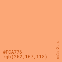Цвет #FCA776 в цветовой модели RGB обозначается тремя октетами (252, 167, 118) в десятичном формате и #FCA776 в шестнадцатиричном (hex) формате, которые являются интенсивностью красного 252 (hex FC), интенсивность зелёного 167 (hex A7) и интенсивность синего 118 (hex 76).