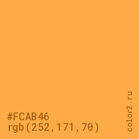 Цвет #FCAB46 в цветовой модели RGB обозначается тремя октетами (252, 171, 70) в десятичном формате и #FCAB46 в шестнадцатиричном (hex) формате, которые являются интенсивностью красного 252 (hex FC), интенсивность зелёного 171 (hex AB) и интенсивность синего 70 (hex 46).