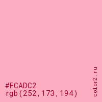 Цвет #FCADC2 в цветовой модели RGB обозначается тремя октетами (252, 173, 194) в десятичном формате и #FCADC2 в шестнадцатиричном (hex) формате, которые являются интенсивностью красного 252 (hex FC), интенсивность зелёного 173 (hex AD) и интенсивность синего 194 (hex C2).