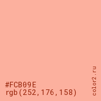 Цвет #FCB09E в цветовой модели RGB обозначается тремя октетами (252, 176, 158) в десятичном формате и #FCB09E в шестнадцатиричном (hex) формате, которые являются интенсивностью красного 252 (hex FC), интенсивность зелёного 176 (hex B0) и интенсивность синего 158 (hex 9E).