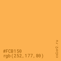 Цвет #FCB150 в цветовой модели RGB обозначается тремя октетами (252, 177, 80) в десятичном формате и #FCB150 в шестнадцатиричном (hex) формате, которые являются интенсивностью красного 252 (hex FC), интенсивность зелёного 177 (hex B1) и интенсивность синего 80 (hex 50).