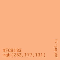Цвет #FCB183 в цветовой модели RGB обозначается тремя октетами (252, 177, 131) в десятичном формате и #FCB183 в шестнадцатиричном (hex) формате, которые являются интенсивностью красного 252 (hex FC), интенсивность зелёного 177 (hex B1) и интенсивность синего 131 (hex 83).