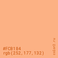 Цвет #FCB184 в цветовой модели RGB обозначается тремя октетами (252, 177, 132) в десятичном формате и #FCB184 в шестнадцатиричном (hex) формате, которые являются интенсивностью красного 252 (hex FC), интенсивность зелёного 177 (hex B1) и интенсивность синего 132 (hex 84).