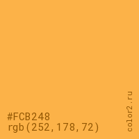 Цвет #FCB248 в цветовой модели RGB обозначается тремя октетами (252, 178, 72) в десятичном формате и #FCB248 в шестнадцатиричном (hex) формате, которые являются интенсивностью красного 252 (hex FC), интенсивность зелёного 178 (hex B2) и интенсивность синего 72 (hex 48).