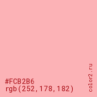 Цвет #FCB2B6 в цветовой модели RGB обозначается тремя октетами (252, 178, 182) в десятичном формате и #FCB2B6 в шестнадцатиричном (hex) формате, которые являются интенсивностью красного 252 (hex FC), интенсивность зелёного 178 (hex B2) и интенсивность синего 182 (hex B6).
