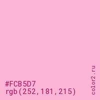 Цвет #FCB5D7 в цветовой модели RGB обозначается тремя октетами (252, 181, 215) в десятичном формате и #FCB5D7 в шестнадцатиричном (hex) формате, которые являются интенсивностью красного 252 (hex FC), интенсивность зелёного 181 (hex B5) и интенсивность синего 215 (hex D7).