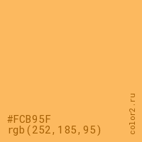 Цвет #FCB95F в цветовой модели RGB обозначается тремя октетами (252, 185, 95) в десятичном формате и #FCB95F в шестнадцатиричном (hex) формате, которые являются интенсивностью красного 252 (hex FC), интенсивность зелёного 185 (hex B9) и интенсивность синего 95 (hex 5F).