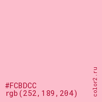 Цвет #FCBDCC в цветовой модели RGB обозначается тремя октетами (252, 189, 204) в десятичном формате и #FCBDCC в шестнадцатиричном (hex) формате, которые являются интенсивностью красного 252 (hex FC), интенсивность зелёного 189 (hex BD) и интенсивность синего 204 (hex CC).