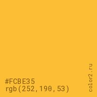 Цвет #FCBE35 в цветовой модели RGB обозначается тремя октетами (252, 190, 53) в десятичном формате и #FCBE35 в шестнадцатиричном (hex) формате, которые являются интенсивностью красного 252 (hex FC), интенсивность зелёного 190 (hex BE) и интенсивность синего 53 (hex 35).