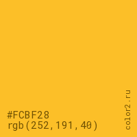 Цвет #FCBF28 в цветовой модели RGB обозначается тремя октетами (252, 191, 40) в десятичном формате и #FCBF28 в шестнадцатиричном (hex) формате, которые являются интенсивностью красного 252 (hex FC), интенсивность зелёного 191 (hex BF) и интенсивность синего 40 (hex 28).
