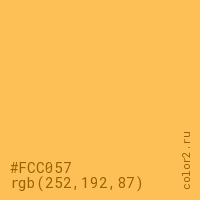 Цвет #FCC057 в цветовой модели RGB обозначается тремя октетами (252, 192, 87) в десятичном формате и #FCC057 в шестнадцатиричном (hex) формате, которые являются интенсивностью красного 252 (hex FC), интенсивность зелёного 192 (hex C0) и интенсивность синего 87 (hex 57).