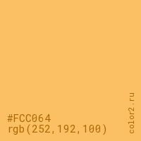 Цвет #FCC064 в цветовой модели RGB обозначается тремя октетами (252, 192, 100) в десятичном формате и #FCC064 в шестнадцатиричном (hex) формате, которые являются интенсивностью красного 252 (hex FC), интенсивность зелёного 192 (hex C0) и интенсивность синего 100 (hex 64).