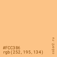 Цвет #FCC386 в цветовой модели RGB обозначается тремя октетами (252, 195, 134) в десятичном формате и #FCC386 в шестнадцатиричном (hex) формате, которые являются интенсивностью красного 252 (hex FC), интенсивность зелёного 195 (hex C3) и интенсивность синего 134 (hex 86).
