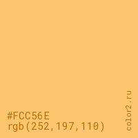 Цвет #FCC56E в цветовой модели RGB обозначается тремя октетами (252, 197, 110) в десятичном формате и #FCC56E в шестнадцатиричном (hex) формате, которые являются интенсивностью красного 252 (hex FC), интенсивность зелёного 197 (hex C5) и интенсивность синего 110 (hex 6E).