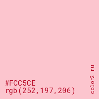 Цвет #FCC5CE в цветовой модели RGB обозначается тремя октетами (252, 197, 206) в десятичном формате и #FCC5CE в шестнадцатиричном (hex) формате, которые являются интенсивностью красного 252 (hex FC), интенсивность зелёного 197 (hex C5) и интенсивность синего 206 (hex CE).