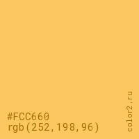 Цвет #FCC660 в цветовой модели RGB обозначается тремя октетами (252, 198, 96) в десятичном формате и #FCC660 в шестнадцатиричном (hex) формате, которые являются интенсивностью красного 252 (hex FC), интенсивность зелёного 198 (hex C6) и интенсивность синего 96 (hex 60).