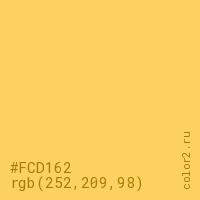 Цвет #FCD162 в цветовой модели RGB обозначается тремя октетами (252, 209, 98) в десятичном формате и #FCD162 в шестнадцатиричном (hex) формате, которые являются интенсивностью красного 252 (hex FC), интенсивность зелёного 209 (hex D1) и интенсивность синего 98 (hex 62).