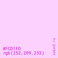 Цвет #FCD1FD в цветовой модели RGB обозначается тремя октетами (252, 209, 253) в десятичном формате и #FCD1FD в шестнадцатиричном (hex) формате, которые являются интенсивностью красного 252 (hex FC), интенсивность зелёного 209 (hex D1) и интенсивность синего 253 (hex FD).