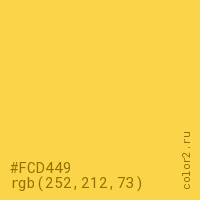 Цвет #FCD449 в цветовой модели RGB обозначается тремя октетами (252, 212, 73) в десятичном формате и #FCD449 в шестнадцатиричном (hex) формате, которые являются интенсивностью красного 252 (hex FC), интенсивность зелёного 212 (hex D4) и интенсивность синего 73 (hex 49).