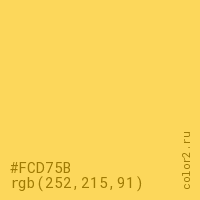 Цвет #FCD75B в цветовой модели RGB обозначается тремя октетами (252, 215, 91) в десятичном формате и #FCD75B в шестнадцатиричном (hex) формате, которые являются интенсивностью красного 252 (hex FC), интенсивность зелёного 215 (hex D7) и интенсивность синего 91 (hex 5B).