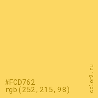 Цвет #FCD762 в цветовой модели RGB обозначается тремя октетами (252, 215, 98) в десятичном формате и #FCD762 в шестнадцатиричном (hex) формате, которые являются интенсивностью красного 252 (hex FC), интенсивность зелёного 215 (hex D7) и интенсивность синего 98 (hex 62).