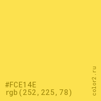 Цвет #FCE14E в цветовой модели RGB обозначается тремя октетами (252, 225, 78) в десятичном формате и #FCE14E в шестнадцатиричном (hex) формате, которые являются интенсивностью красного 252 (hex FC), интенсивность зелёного 225 (hex E1) и интенсивность синего 78 (hex 4E).