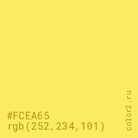 Цвет #FCEA65 в цветовой модели RGB обозначается тремя октетами (252, 234, 101) в десятичном формате и #FCEA65 в шестнадцатиричном (hex) формате, которые являются интенсивностью красного 252 (hex FC), интенсивность зелёного 234 (hex EA) и интенсивность синего 101 (hex 65).