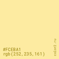 Цвет #FCEBA1 в цветовой модели RGB обозначается тремя октетами (252, 235, 161) в десятичном формате и #FCEBA1 в шестнадцатиричном (hex) формате, которые являются интенсивностью красного 252 (hex FC), интенсивность зелёного 235 (hex EB) и интенсивность синего 161 (hex A1).